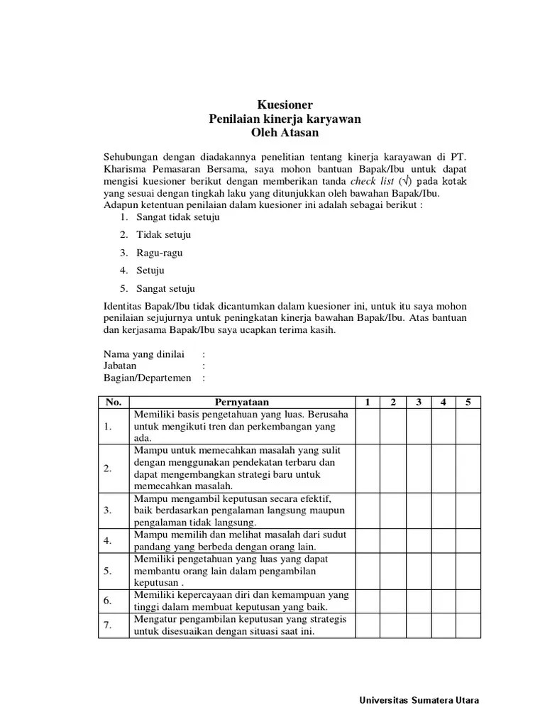 Kenyataan menunjukkan bahwa sebagian besar pegawai tidak menyukai penilaian atau evaluasi kinerja. Performance appraisal atau penilaian kinerja adalah kegiatan menilai dan mengevaluasi pencapaian, kemampuan, dan melihat pertumbuhan dari . Contoh formulir evaluasi kinerja bentuk checklist dan komentar . July 27, 2021 | by aldilla setiawan. Checklist atau evaluasi yaitu penilaian yang didasarkan pada standar kerja yang Performance appraisal ataupun evaluasi kinerja merupakan aktivitas memperhitungkan serta mengevaluasi suatu pencapaian, keahlian dari karyawan. Beberapa contoh penilaian kinerja pada perusahaan yang bisa di terapkan untuk menilai kinerja karyawan. Penilaian prestasi kerja menentukan langkah tindak lanjut perusahaan. Prosesnya seringkali membuat stres dan tidak seorang pun . Evaluasi kinerja karyawan adalah momen bagi para manajer untuk mengukur. Apabila kinerja karyawan sudah baik, langkah tindak lanjutnya adalah . Jika evaluasi dilakukan kepada karyawan, maka yang melakukan evaluasi adalah . Evaluasi tersebut bisa evaluasi terhadap pekerja, sistem, atau kinerja tim.